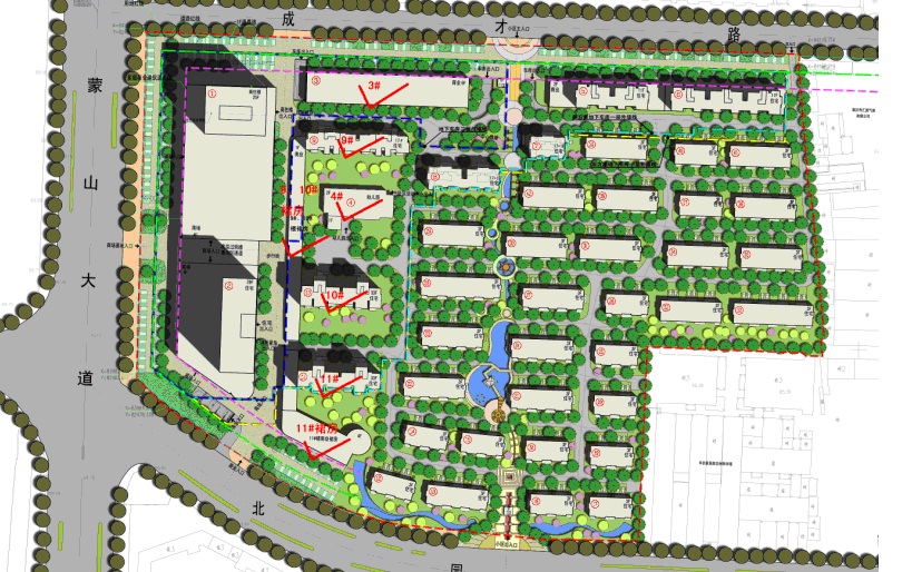 从中环境上讲:小区的东方有繁华的商业区,这叫青龙得势,小区的西边蒙山大道这叫白虎降服,小区的南边是北园路这叫明堂开阔 。小区北边有楼群这叫玄武有靠。也符合好的风水格局。